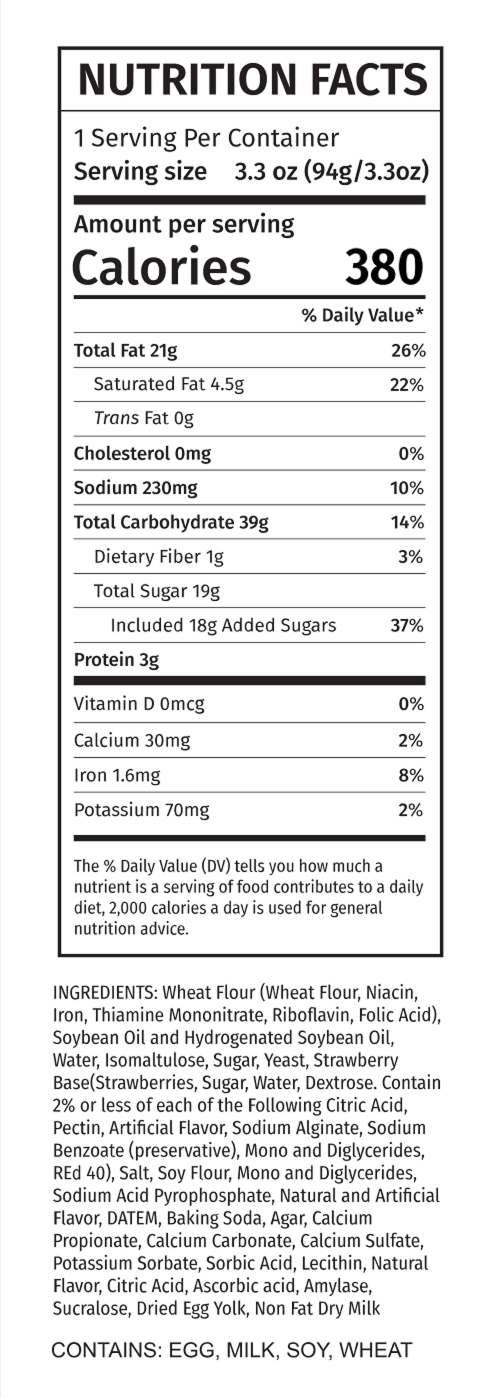 Our mouth watering STRAWBERRY glazed raised donut can be shipped to you in a "RETAIL" case or "BULK" case system.  The RETAIL case includes 8 inner trays ("sleeves") with each tray holding 8 donuts for a total case count of 64 units / donuts.  The inner tray has been designed so that the sleeve can be easily and conveniently displayed on counters or gondolas.  The BULK case system excludes the inner trays allowing for 72 units / donuts to be included in the case and easy for usage in vending or repackaging situations. See below for package details.  For information about Nutritional Facts and Ingredients, please click on the "Nutritional Info" link below.